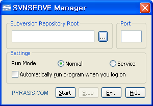 Windows용 Subversion의 svnserve.exe 매니져입니다. svnserve.exe는 Subversion의 svn:// 프로토콜 서버입니다. svnserve.exe를 편리하게 사용할 수 있도록 도와줍니다.