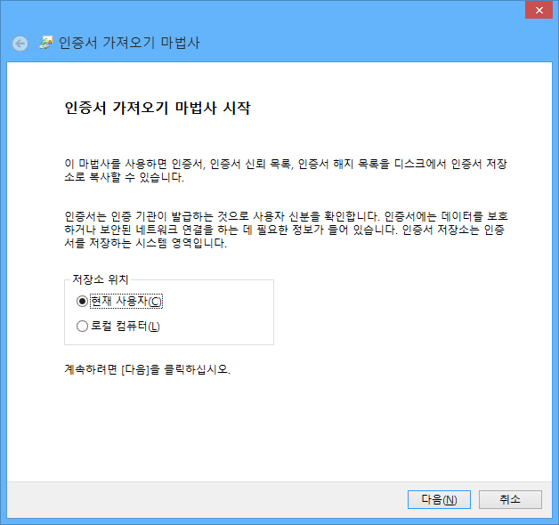 인증서 가져오기 마법사가 실행됩니다. 다음 버튼을 클릭합니다.