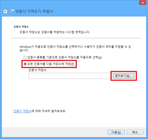 모든 인증서를 다음 저장소에 저장(P)를 선택하고 찾아보기 버튼을 클릭합니다.