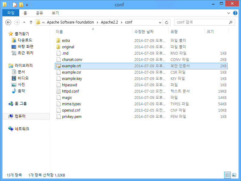 탐색기에서 C:\Program Files (x86)\Apache Software Foundation\Apache2.2\conf 디렉터리로 이동한 뒤 example.crt 파일을 더블클릭합니다.