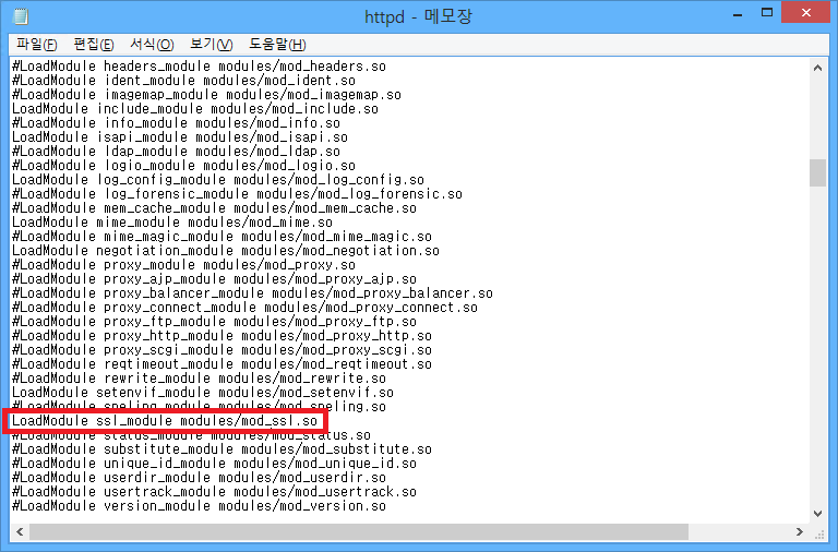 아파치 설정 파일 C:\Program Files (x86)\Apache Software Foundation\Apache2.2\conf\httpd.conf에서 mod_ssl.so 부분의 #을 삭제하여 ssl_module을 활성화 시킵니다.