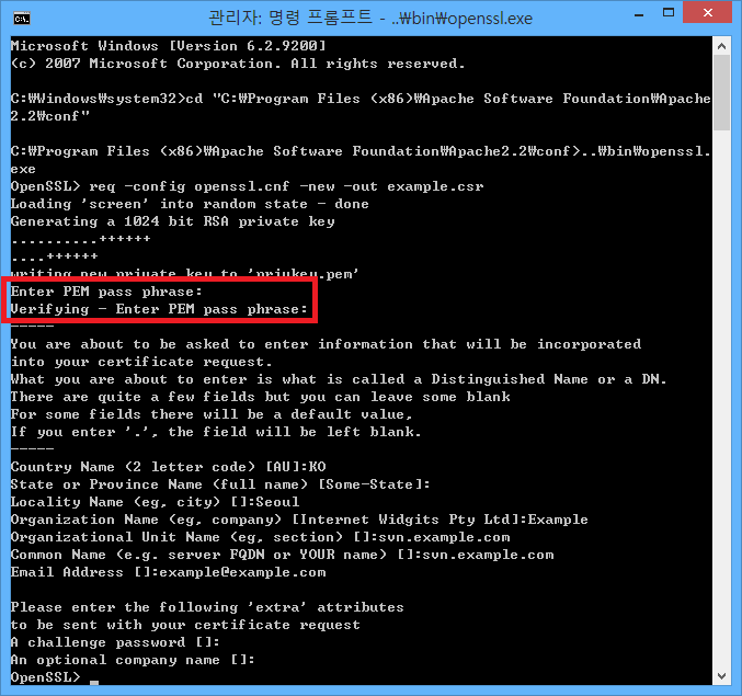 - Enter PEM pass phrase:에서는 개인키에서 사용할 암호를 입력합니다.