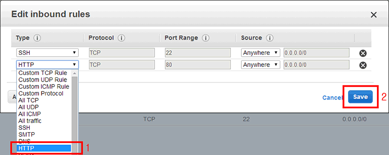 - Type: HTTP를 선택하면 자동으로 Protocol은 TCP, Port Range는 80으로 설정됩니다.