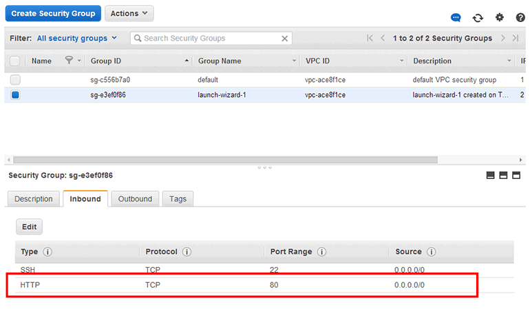 launch-wizard-1의 Inbound 목록을 보면 HTTP 규칙이 추가된 것을 확인할 수 있습니다.