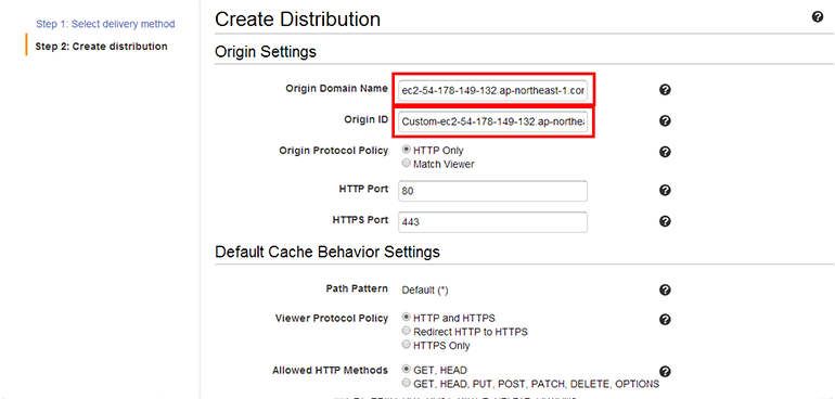 - Origin Domain Name: 커스텀 오리진을 사용하려면 이곳에 오리진 서버의 도메인을 설정하면 됩니다. EC2 인스턴스(Example Server)의 Public DNS를 입력합니다(예: ec2-54-178-149-132.ap-northeast-1.compute.amazonaws.com).