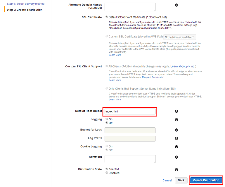 - Distribution State: 배포를 생성한 뒤 배포 상태 설정입니다. Enabled로 설정하면 곧바로 사용할 수 있는 상태가 되며 Disabled로 설정하면 그냥 배포만 생성하고 비활성화 상태로 둡니다. 기본값 그대로 사용합니다.