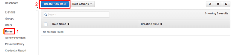 IAM 역할 목록(Details → Roles)에서 위쪽 Create New Role 버튼을 클릭합니다.