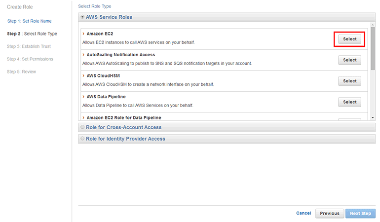 - AWS Service Roles: AWS 리소스 전용 IAM 역할입니다. EC2, CloudHSM, Data Pipeline, Elastic Transcoder, OpsWorks 등을 선택할 수 있습니다.