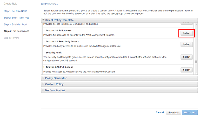IAM 역할이 S3에만 접근할 수 있도록 설정해보겠습니다. Select Policy Template에는 AWS의 모든 리소스에 대한 접근 권한을 Full Access, Read Only Access, 기타 Access로 구분하여 준비해놓았습니다. 개수가 상당히 많으므로 스크롤을 내려 Amazon S3 Full Access의 Select 버튼을 클릭합니다.