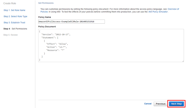 S3에만 접근할 수 있도록 해주는 정책 파일Policy Document이 자동으로 생성됩니다. Next Step 버튼을 클릭합니다.