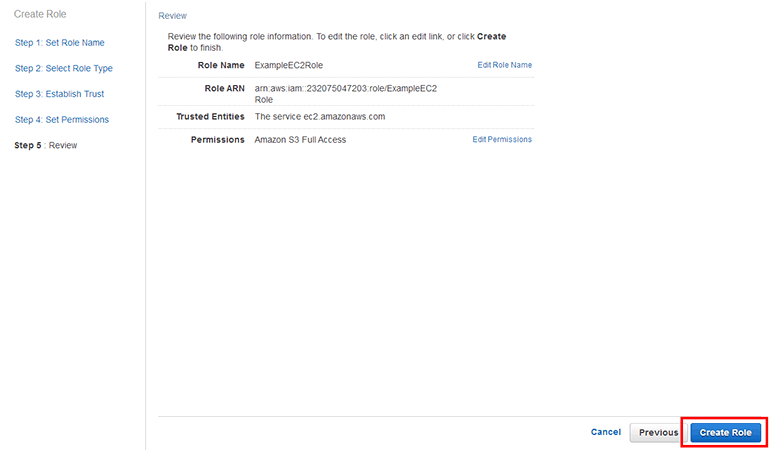 지금까지 설정한 내용에 이상이 없는지 확인합니다. 이상이 없으면 Create Role 버튼을 클릭합니다.