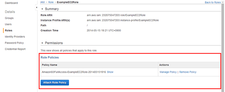 IAM 역할 목록에 IAM 역할(ExampleEC2Role)이 생성되었습니다. IAM 역할(ExampleEC2Role)을 선택한 뒤 세부 내용을 보면 Permissions에 현재 설정된 정책이 표시됩니다. Attach Role Policy 버튼으로 정책을 계속 추가할 수 있습니다.