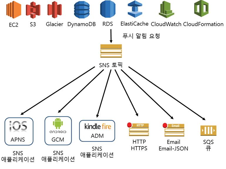 SNSSimple Notification Service는 iPhone, iPad, Android, Kindle Fire와 같은 모바일 장치에 푸시 알림을 보낼 수 있는 서비스입니다. 또한, 이메일과 SMS 문자 메시지, SQS 큐 메시지도 보낼 수 있습니다.
