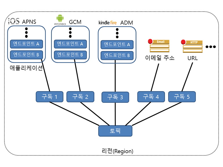 모바일 장치에 푸시 알림을 보내려면 서버를 구축하고 APNSApple Push Notification Service, GCMGoogle Cloud Messaging, ADMAmazon Device Messaging에 각각 전송 요청을 해야 합니다. SNS를 사용하면 푸시 알림 요청 한 번으로 동시에 애플 iOS, 구글 안드로이드, 아마존 킨들 파이어로 푸시 알림을 보낼 수 있습니다. 따라서 APNS, GCM, ADM 전송 코드를 일일이 구현하지 않아도 됩니다. 또한, HTTP 접속, 이메일 전송, SQS 큐 메시지 전송 기능도 있습니다.